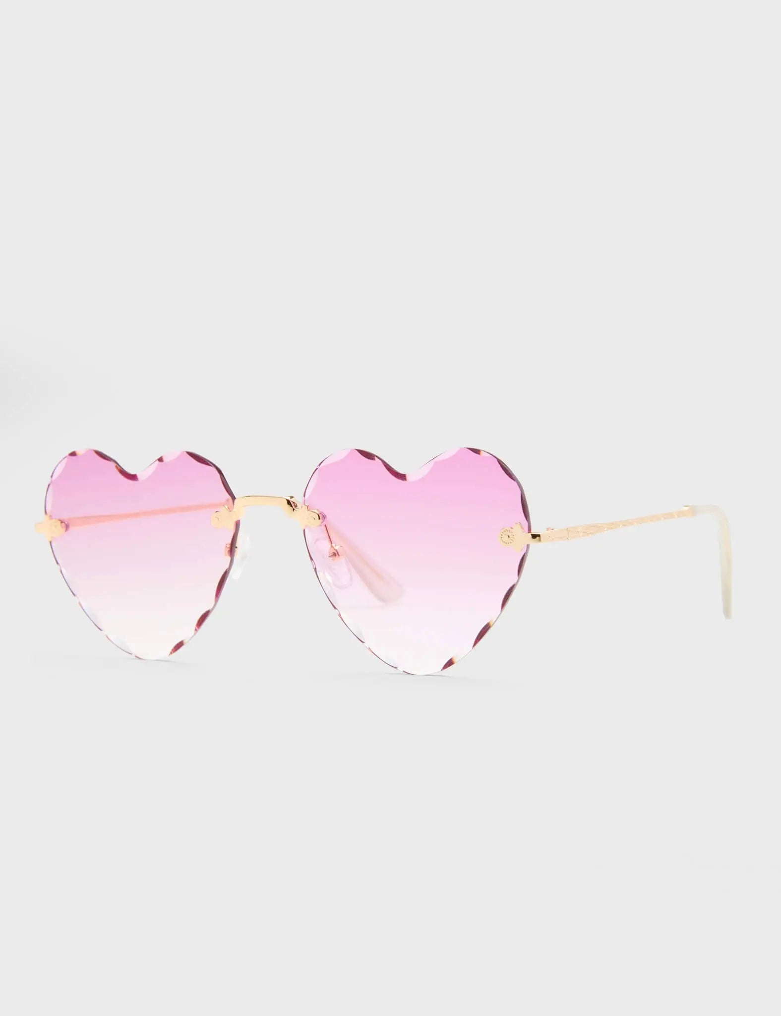 Eye Candy Heart Sunglasses. These Heart sunglasses feature antique style Gold arms, and a Pink tinted heart shaped lens.