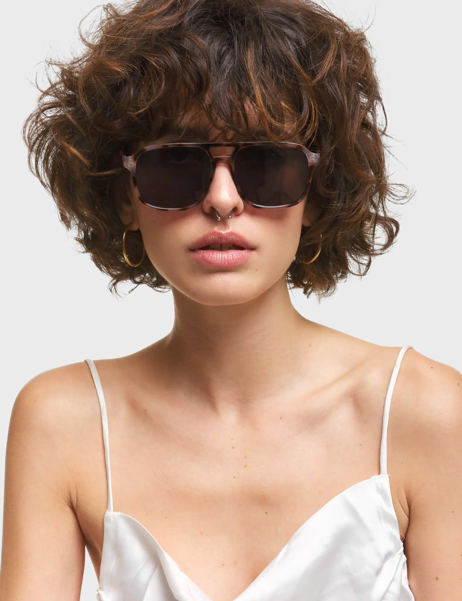 Shelly Aviator Sunglasses. These Aviator sunglasses feature a Brown Leopard print frame, and a Dark Purple / Black tinted lens.