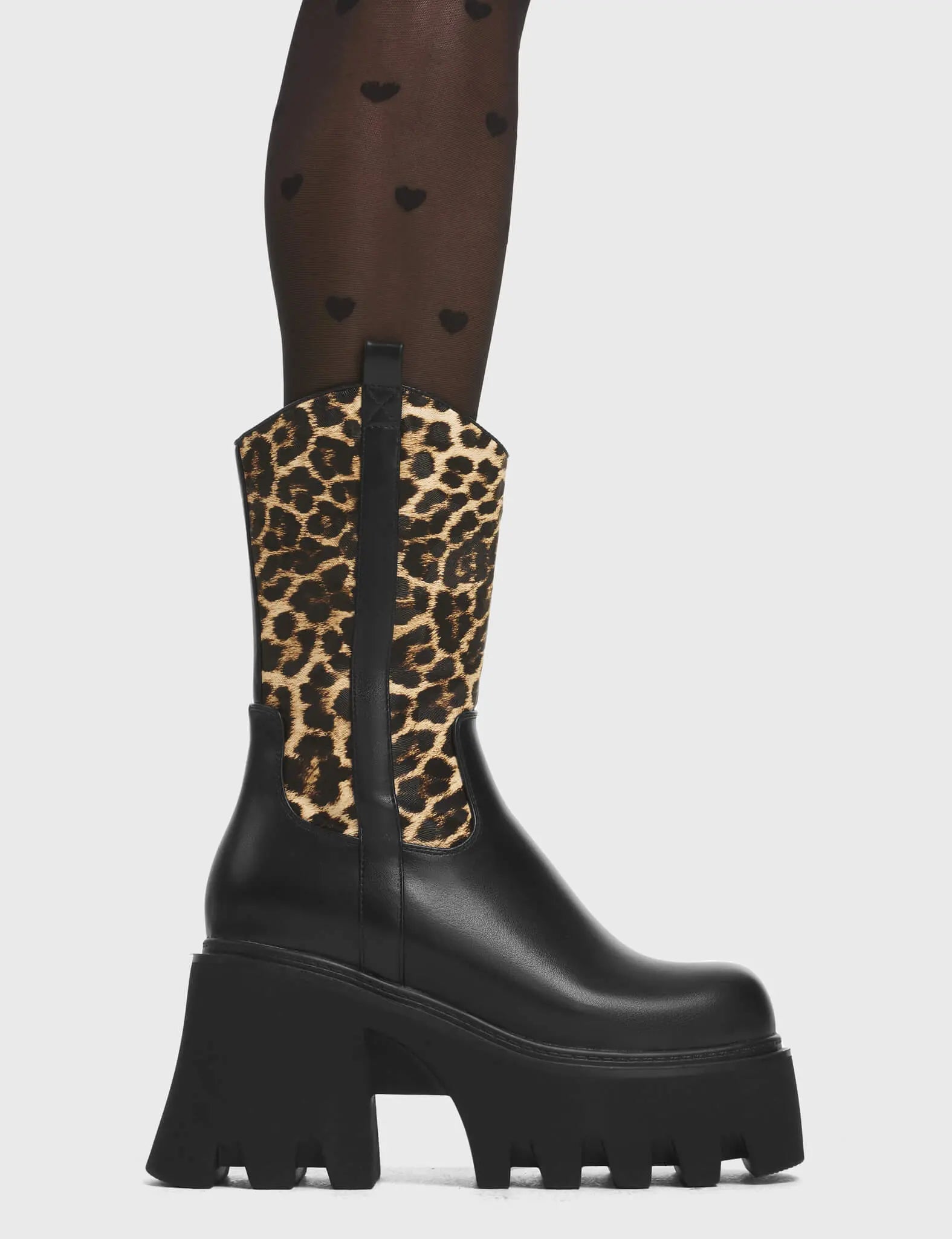 Virtuous Chunky Platform Ankle Boots in Black and Leopard faux leather. These vegan platform boots feature a western-style upper on a chunky platform heel, with easy pull-on tabs at the top of the boot. Made with eco-friendly materials and 100% cruelty-free!