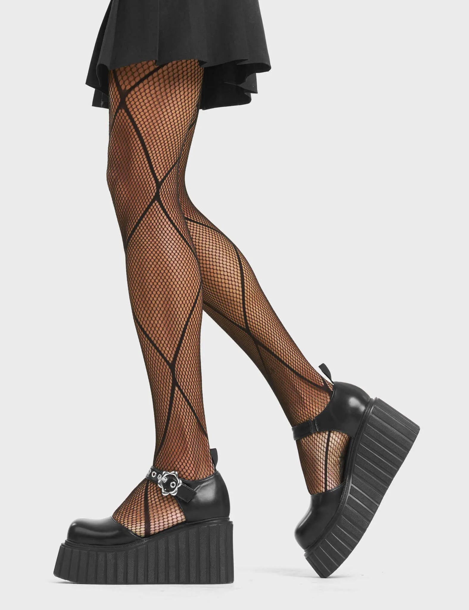 Spring Sunshine Platform Creeper Shoes in Black Faux Leather. These vegan creeper shoes feature silver eyelets on a adjustable strap with a flower shaped silver buckle, very classy. Made with eco-friendly materials and 100% cruelty-free, these shoes are as ethical as they are edgy!