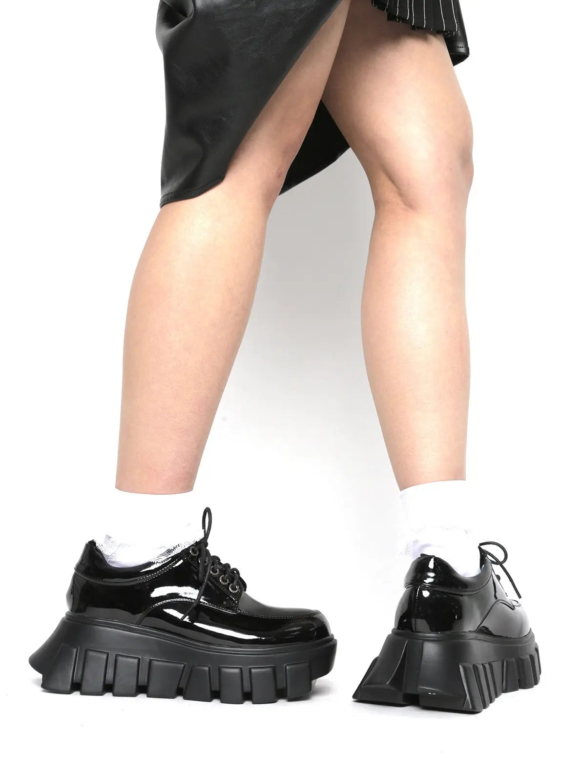 • Chunky platform sneakers in sleek Black Patent for a gothic, alternative style