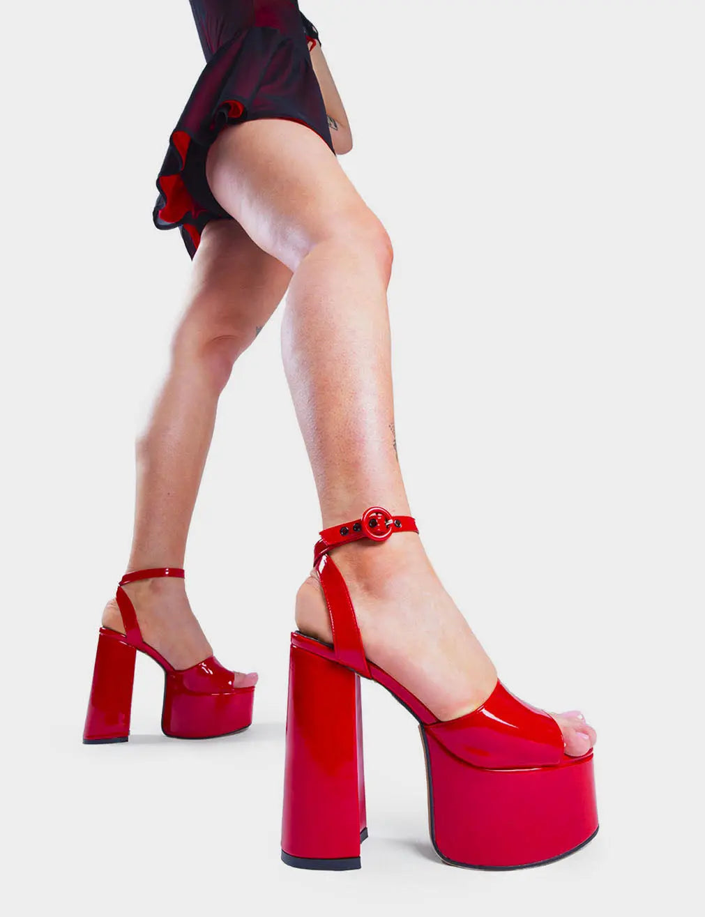 All For You Platform Sandals in Red Patent. These high heeled vegan Sandals feature an adjustable ankle strap with a Platform sole and high heel, perfect for adding height and glamour to any outfit. Made with eco-friendly materials and 100% cruelty-free, these Sandals are as ethical as they are hot!