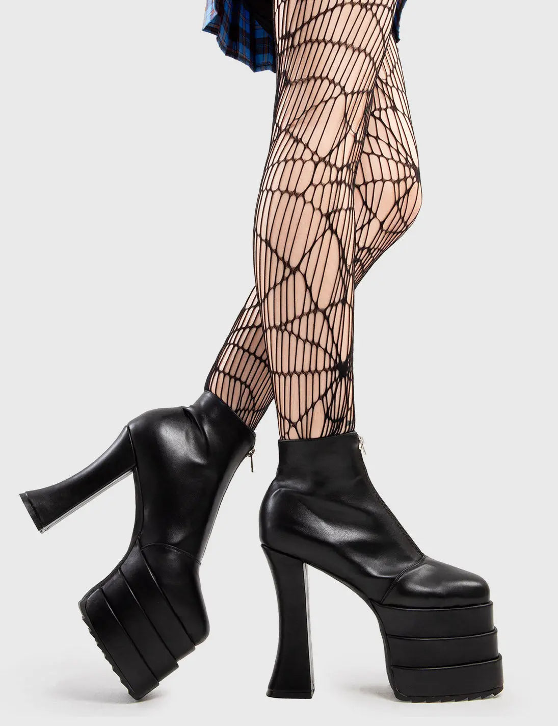 Mercury Retrograde Chunky Platform Ankle Boots faux leather. These Black vegan Boots feature a platform sole and heel, perfect for adding height and style to any outfit. Made with eco-friendly materials and 100% cruelty-free.